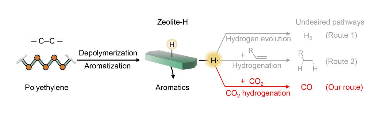 此项研究演示了一个芳香化-氢捕获的耦合过程,在多功能ZEO-OX催化剂上将PE和CO2转化为有价值的芳香烃和CO。根据催化和表征结果,阐明了CO2介导的氢捕获途径。在该机制中,HZSM-5酸位点PE芳构化产生的氢迁移到邻近的CuZnZrOx氢受体池中进行二氧化碳还原。一次防止了二次反应,如芳香族前体烯烃的加氢和氢解。在温和条件下(380 ℃),CO2转化率可达1.5 mmol gPE−1 (20 bar CO2),芳烃收率最高为62.5 wt %。芳构化与氢捕获的耦合机理为富氢聚烯烃和贫氢CO2废弃物资源的转化和循环利用提供了新的思路。