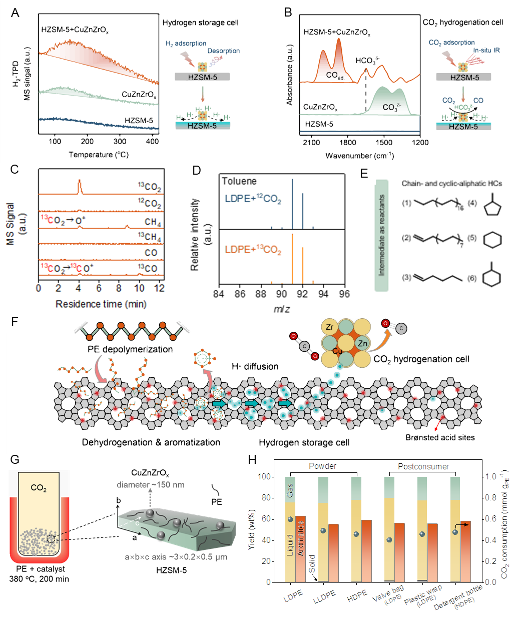通过原位的氢气程序脱附、CO2原位吸附红外、13C同位素标记和模型反应物的验证,发现CO2通过原位消耗聚乙烯芳构化过程中产生的活性氢物种,有效的提高了芳烃的产率。并阐明了催化体系的构效关系,即HZSM-5充当“储氢池”,CuZnZrOx充当“CO2加氢池”的机制。