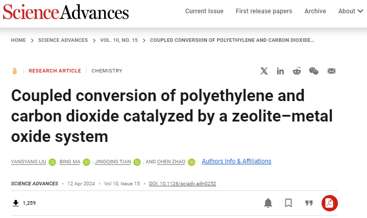 鉴于此,色播 赵晨教授研究团队在废弃碳资源塑料和CO2的高价值利用上取得重要进展。构建了沸石-金属氧化物多相催化体系,通过芳构化-氢捕获机制耦合转化废弃聚乙烯与CO2为芳烃和CO。综合多种原位表征、同位标记、模型物的验证等手段,阐释了芳构化-氢捕获的反应机理。相关研究以“Coupled conversion of polyethylene and carbon dioxide catalyzed by a zeolite–metal oxide system”为题,于2024年4月12日发表于Science Advances。